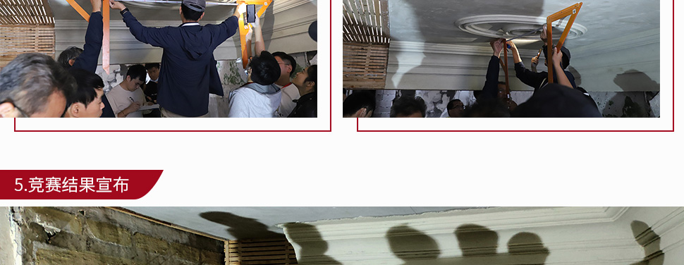 今年的競賽項目是以傳統(tǒng)工藝制作天花線腳和燈圈。賽程分為三天,難度大,時間緊。由于我們抽簽為11號,最后才輪到我們測量和繪圖,因此時間異常緊迫。測量完后自行準備模具、導軌,第二天再到現(xiàn)場在4小時內準備線腳、燈圈糙坯制作。第三天需要在4小時扯制線腳、燈圈,可謂是分秒必爭。